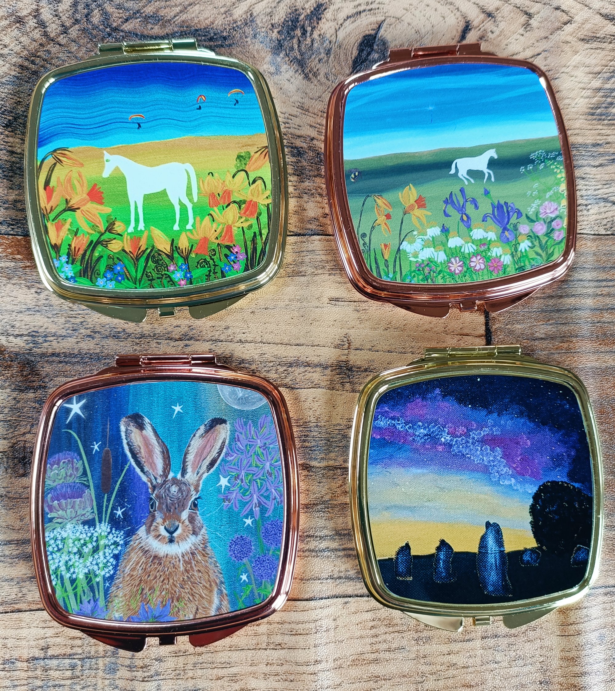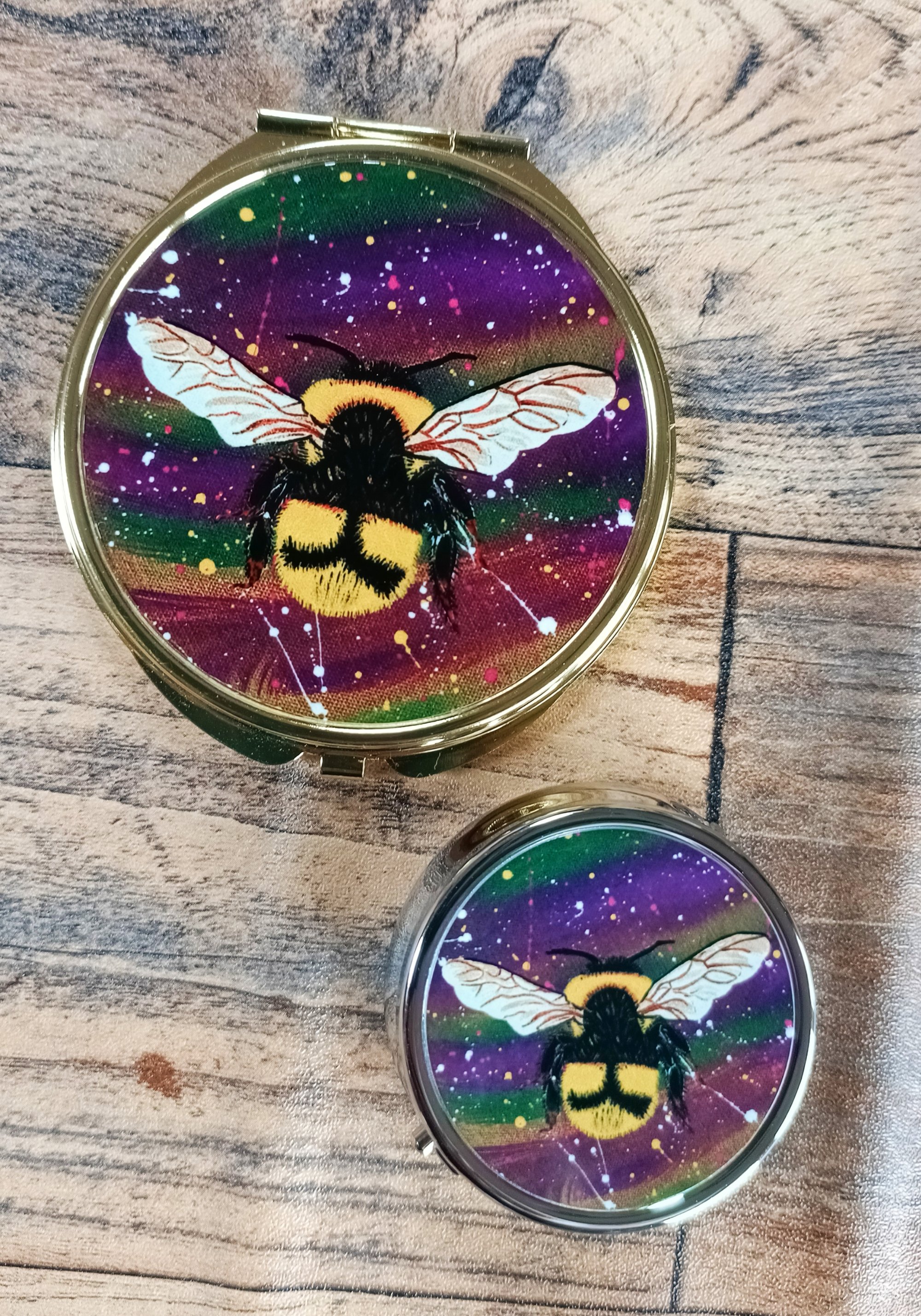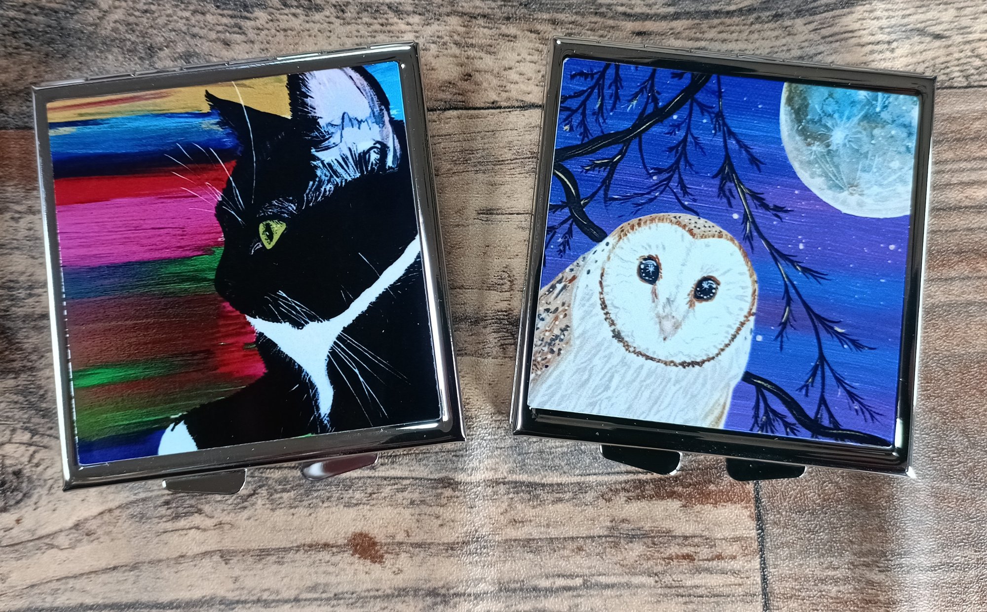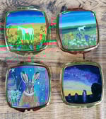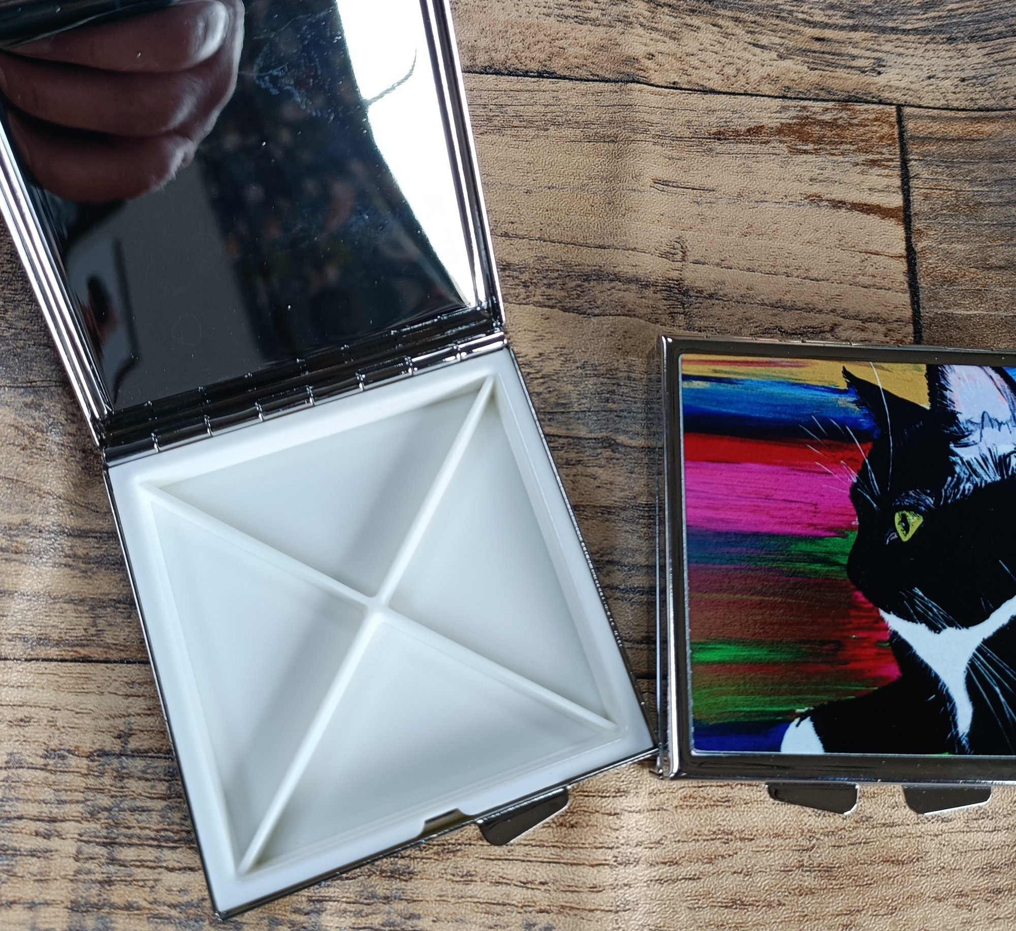 A compact mirror or pill box featuring my artwork